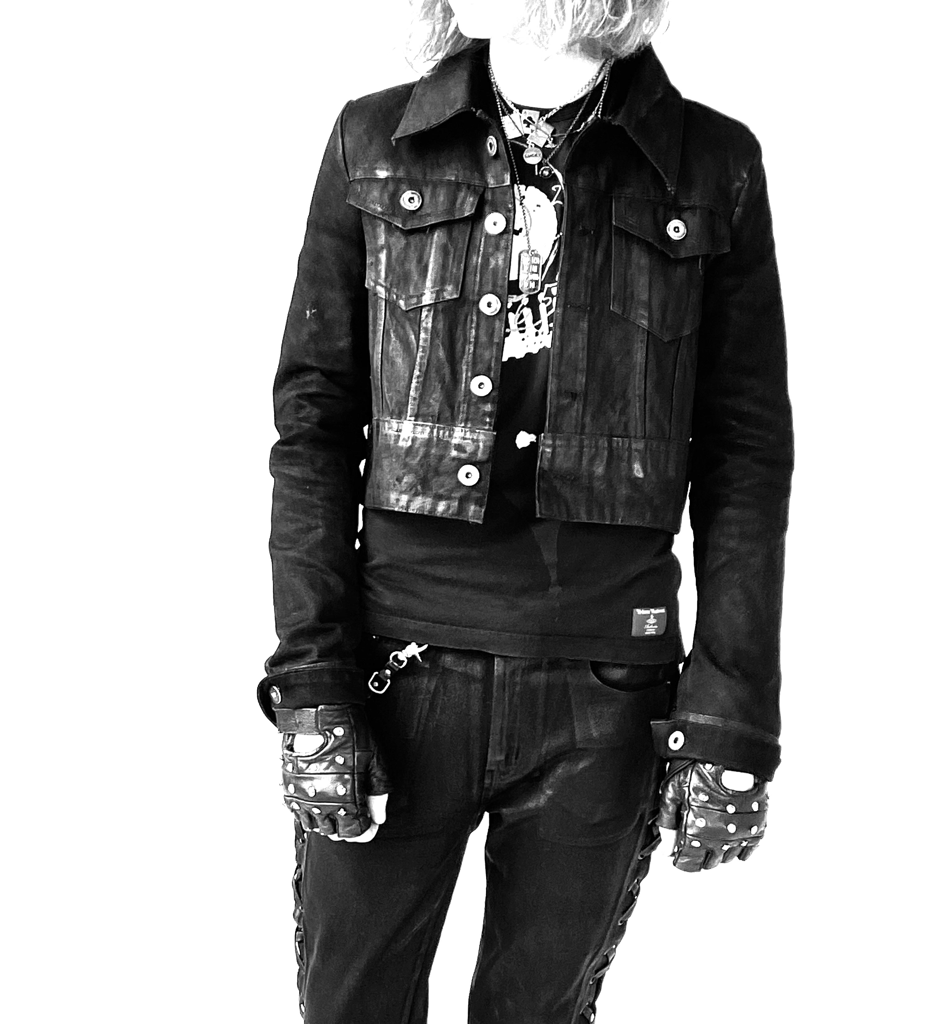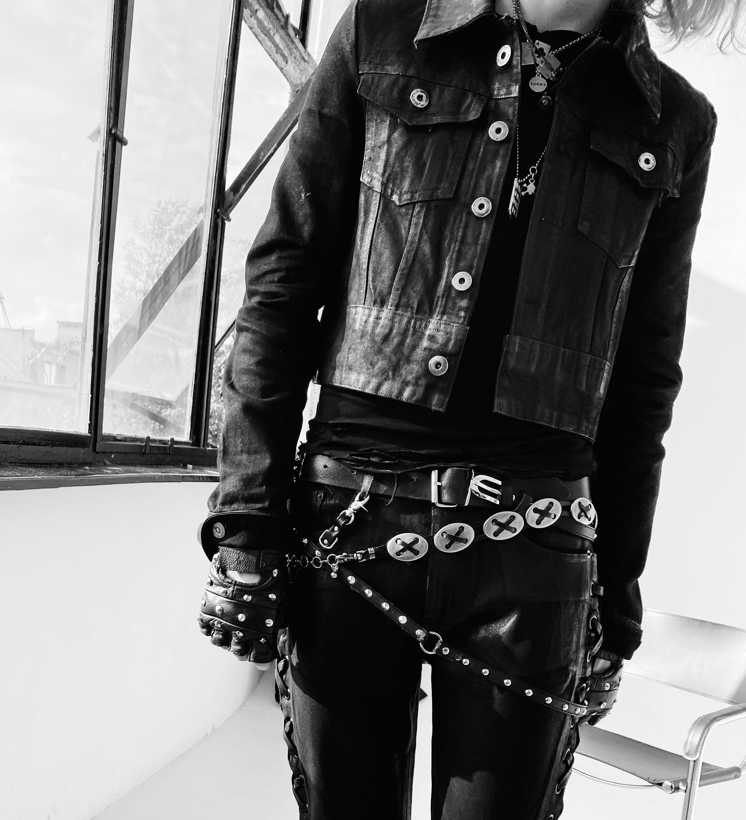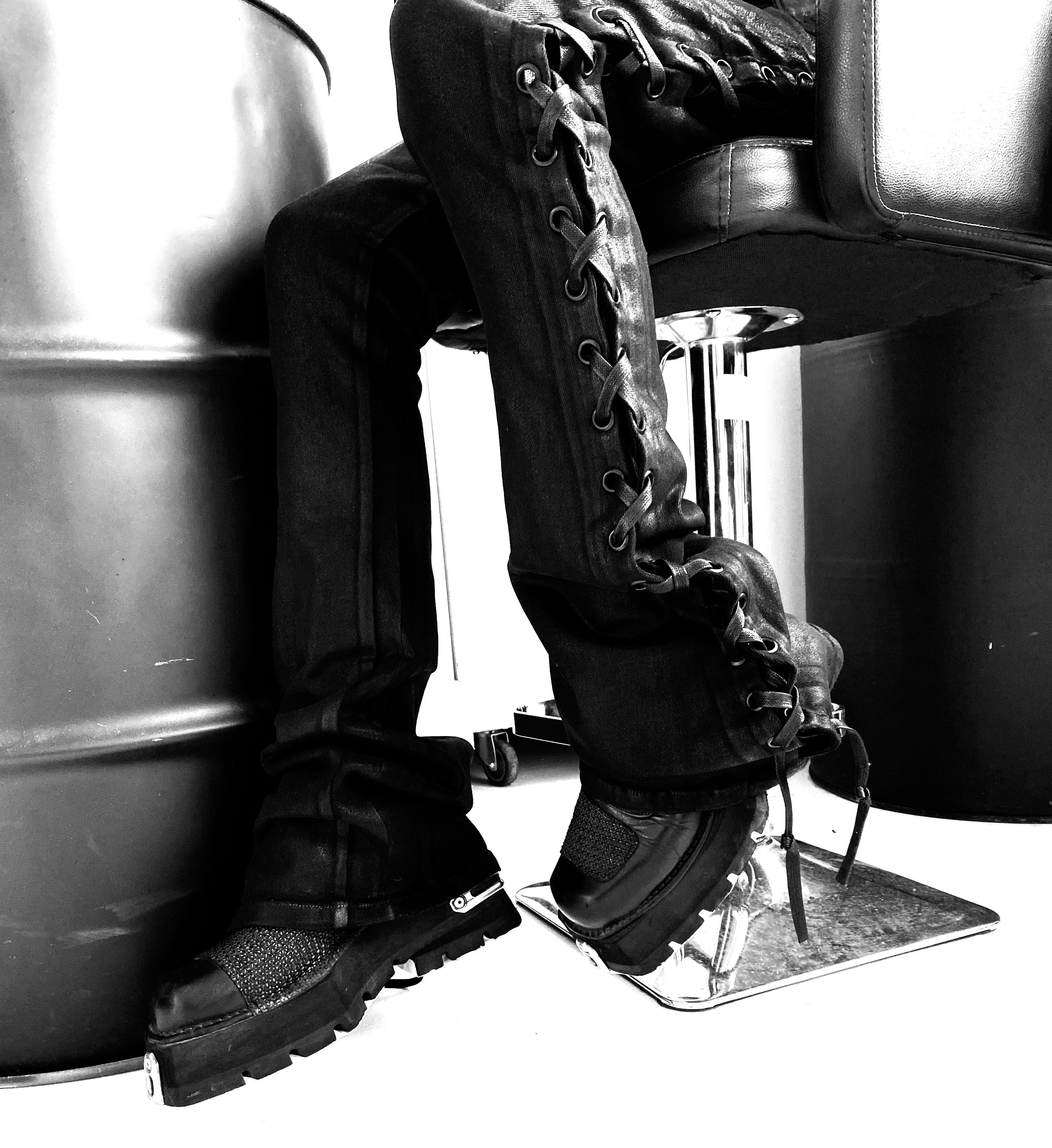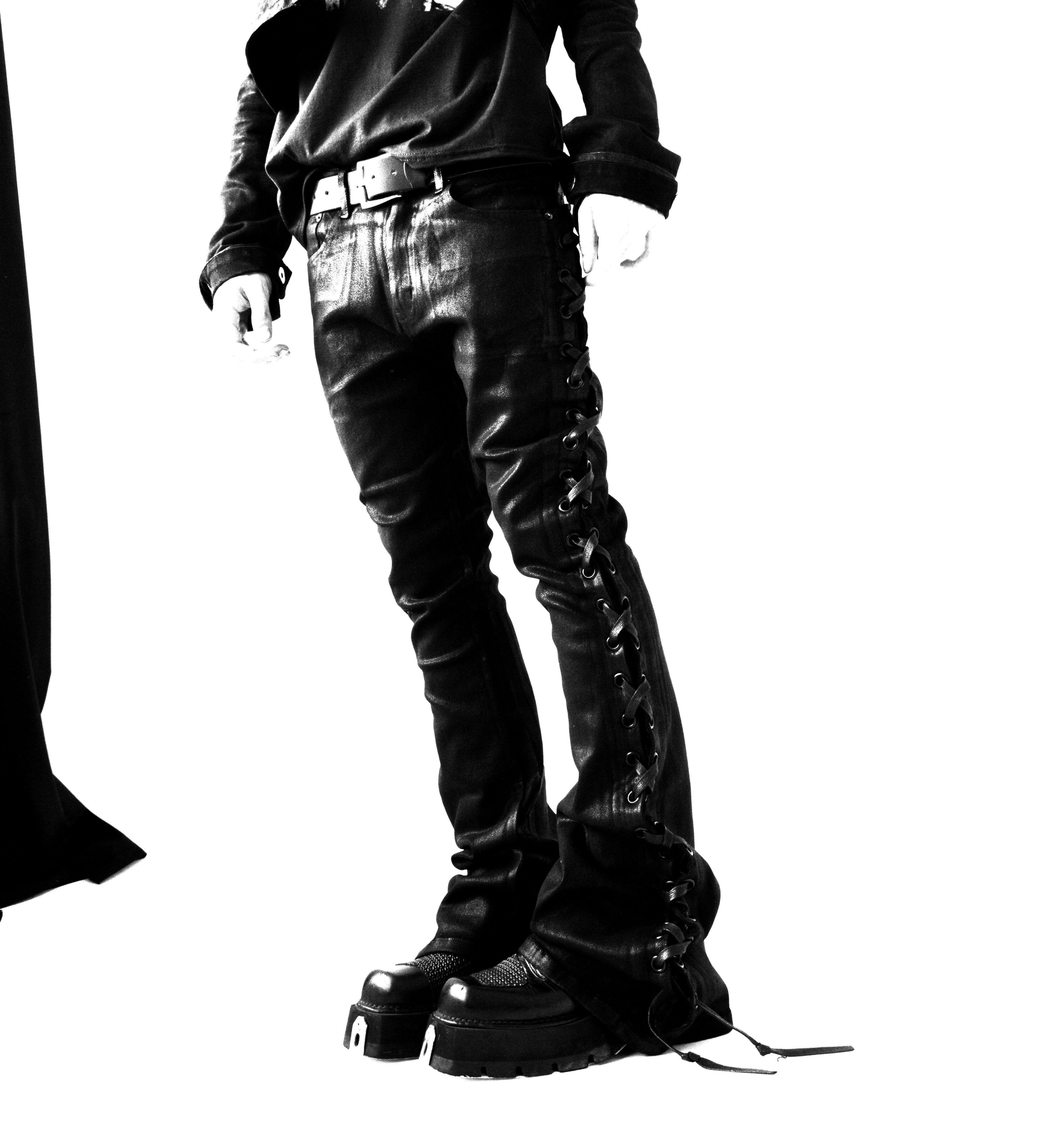 Kickflare pants carved from heavyweight waxed denim, bound by a relentless side lace that traces the leg from belts to boots. The silhouette challenges form and function, balancing raw tension with drooping release.